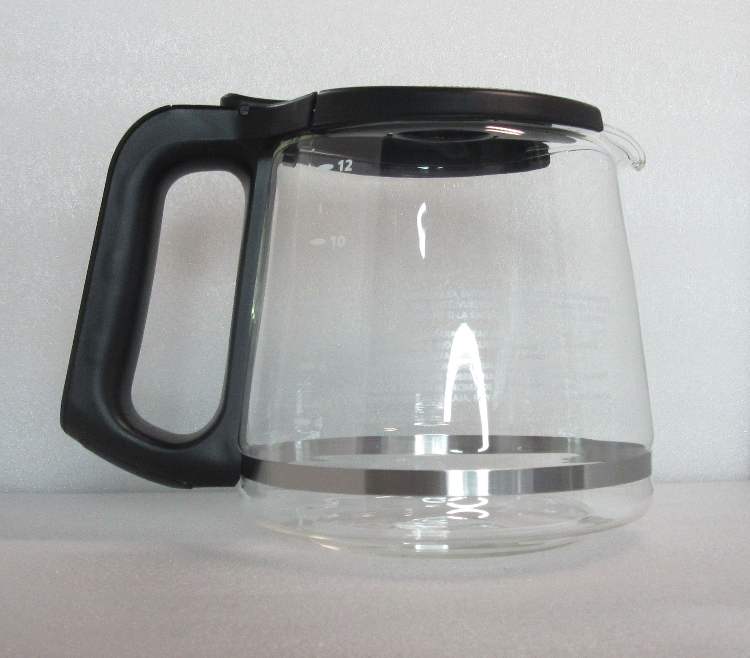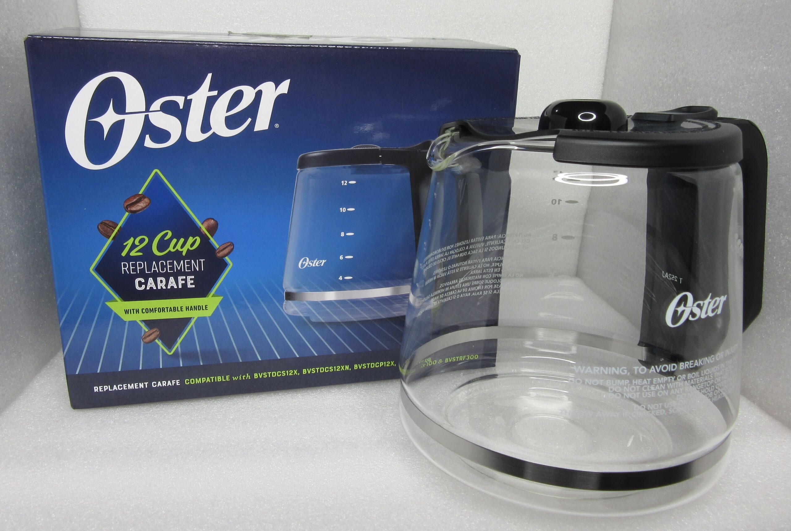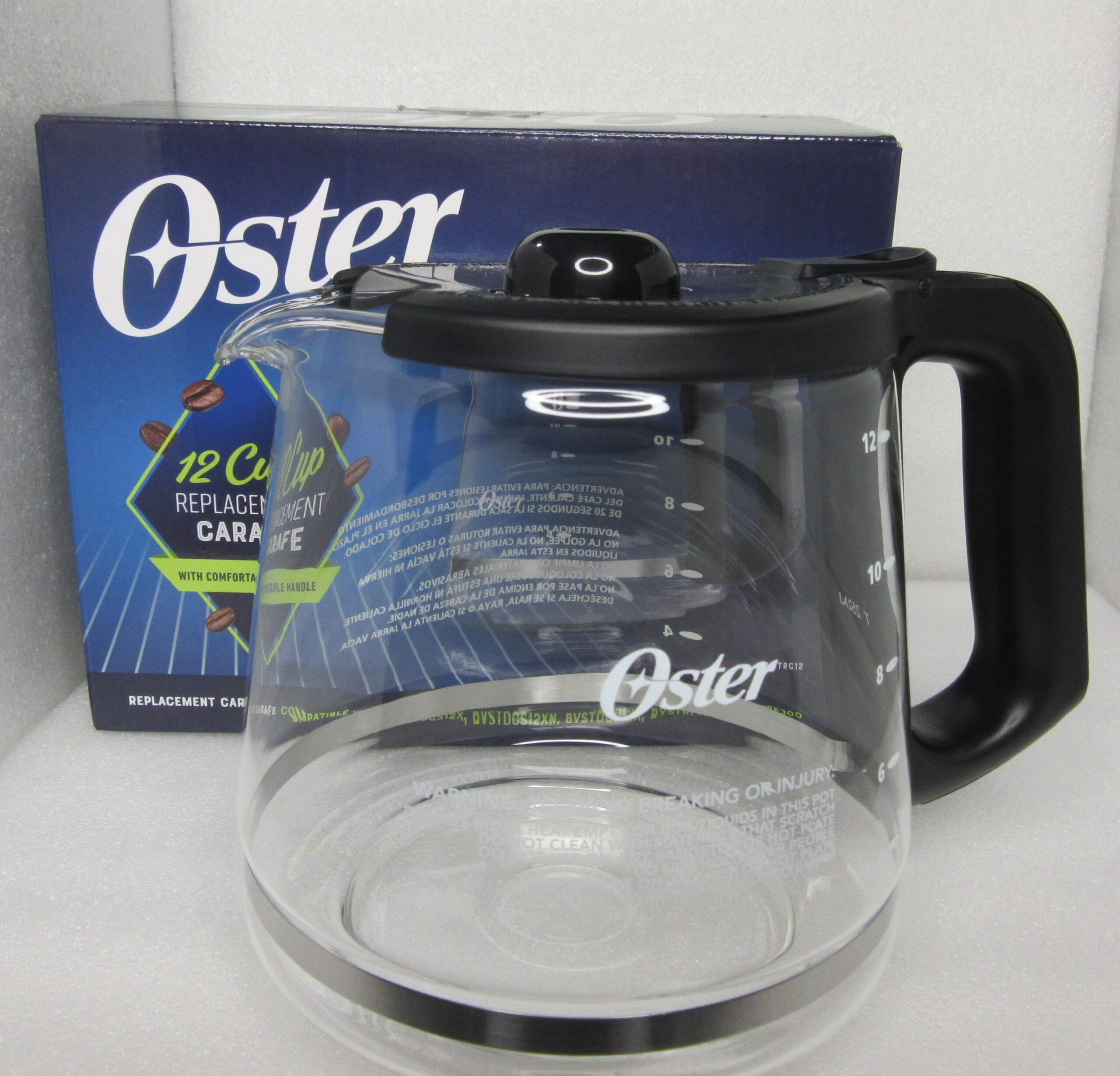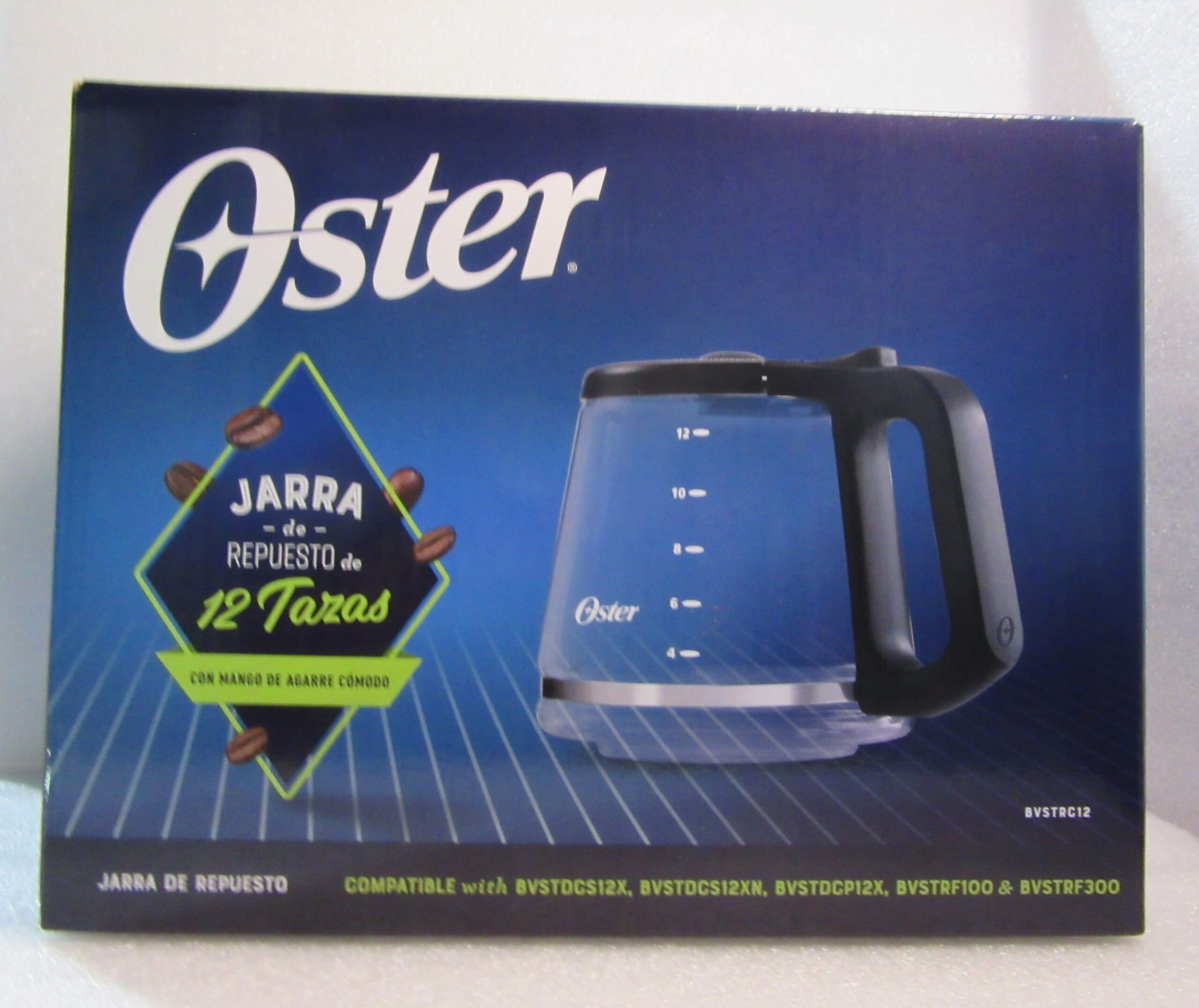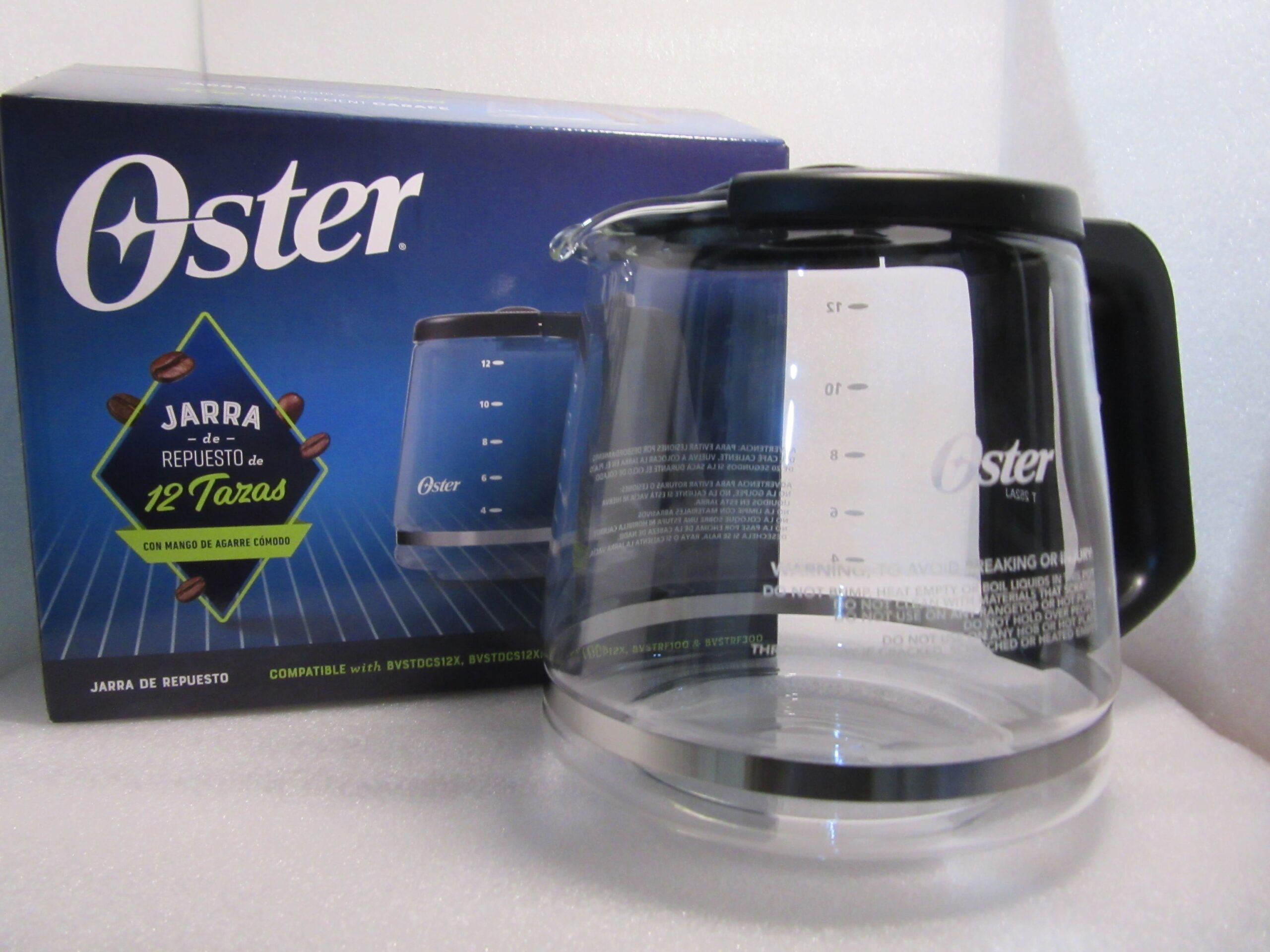Jarra para cafetera Oster 12 tazas compatible a los modelos BVSTRF100 / BVSTDCP12B / BVSTDCS12B, pico anti goteo no puede ser usada en hornillas de cocina, horno, NI TAMPOCO EN EL HORNO MICROONDAS. No colocar la jarra caliente en superficies frías o mojadas. NO limpie la jarra con polvos limpiadores, fibras metálicas o de lana o cualquier otro material abrasivo.
